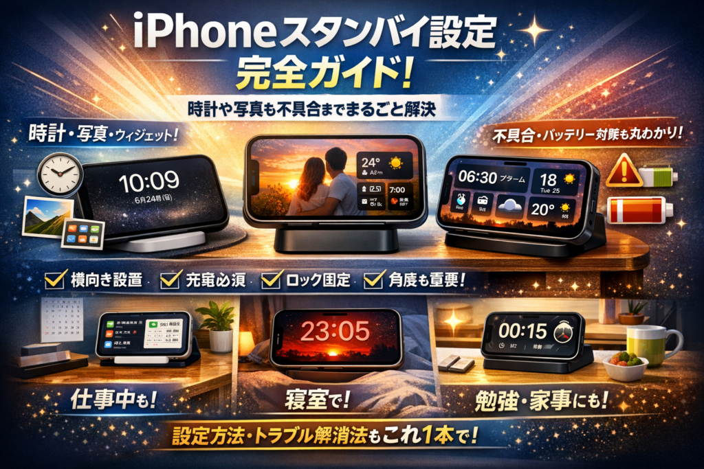 本記事は、よくある「スタンバイとは何か」「設定方法はこちらです」といった表面的な解説で終わらせず、スタンバイが動く4条件やオンオフの切り替えだけでなく、時計だけ表示したい、色や写真をおしゃれに変えたい、ウィジェットで情報ボード化したいといったニーズまで一気に整理します。
