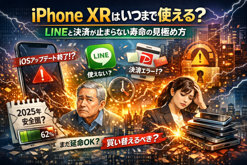この記事では、iPhoneXRがいつまで使えるかを「OSアップデート」「セキュリティアップデート」「アプリの対応状況」「バッテリーとハード劣化」「仕事用スマホとしての安全圏」という五つの軸に分解し、2025年以降もどこまで実用的に使えるかを具体的な年数イメージで整理します。電話とLINE中心のユーザー、決済や銀行アプリを多用するユーザー、子ども用や社用スマホとして使うケースまで、用途別に「延命してよいライン」と「さすがに買い替えたほうがいいライン」を切り分けます。