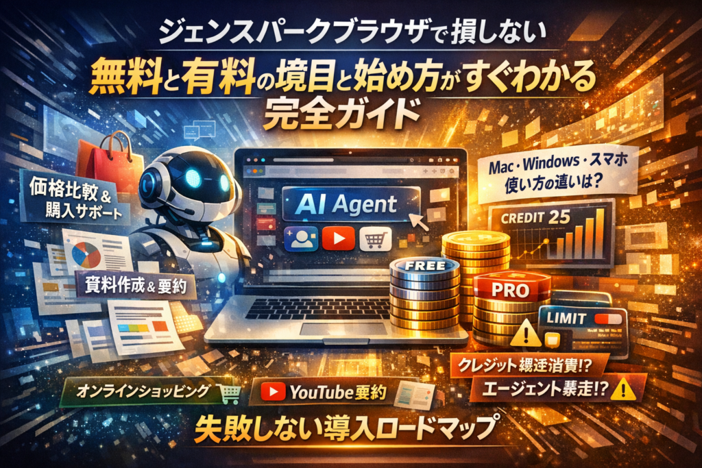 本記事は、ジェンスパーク AIブラウザの機能紹介にとどまらず、オンラインショッピングやYouTube要約、資料作成、SlackやNotion連携まで「実際にどこまで任せてよいか」を生活と業務のシーンごとに分解します。そのうえで、Mac/Windows/スマホ別の体験差、無料と有料の境目、クレジット爆速消費やエージェント暴走といった失敗パターンを一次情報ベースで整理し、あなたの仕事でジェンスパーク ブラウザを入れるべきか、入れるならどのプランと使い方が損をしないかを一本の導入ロードマップとして提示します。ここを押さえずにジェンスパークを入れるかどうかを決めるのは、条件を聞かずにサブスク契約するのと同じです。読み進めながら、最短で自分にとっての最適解を確定させてください。