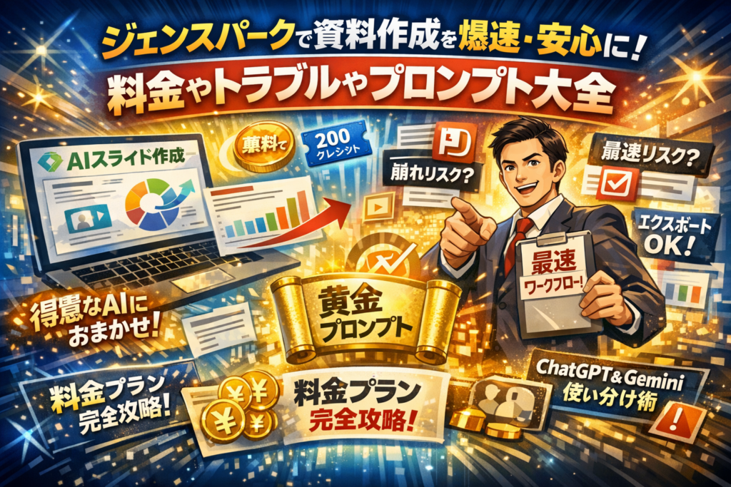 本記事では、ジェンスパークAIスライドに任せていい作業と人がやるべき最後の3割を切り分けたうえで、登録からスライド起動までの最短手順、無料でできるライン、Genspark資料作成プロンプトの黄金テンプレを用途別に提示します。さらに、エクスポートできない時やGensparkパワポ出力でレイアウトが崩れる原因と対処、200クレジットどのくらい使えるかという料金の「肌感」、ChatGPTやGeminiとの使い分け、社内ルールづくりまで一気通貫で扱います。
