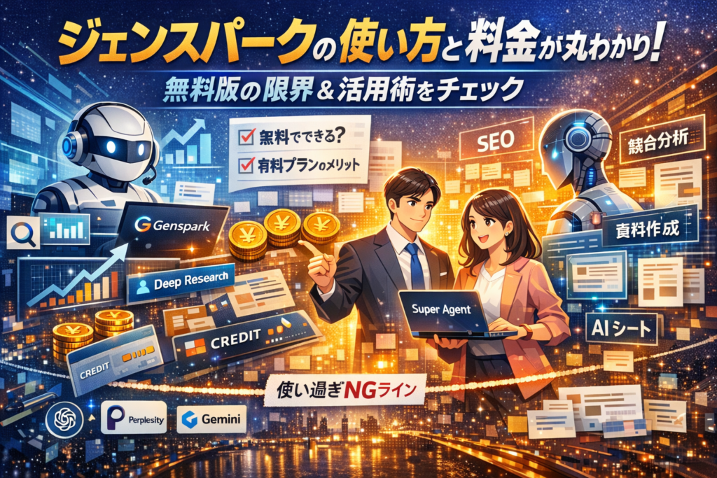 本記事では、Gensparkの正体や運営会社の安全性、料金とクレジットの仕組み、無料版でできる範囲を整理したうえで、SparkpagesやDeep Research、スーパーエージェント、AIスライド・AIシートといった主要機能の使い方を、実務の流れに沿って分解します。単なる機能紹介ではなく、SEO記事や企画書、営業資料の現場で「どこまでAIリサーチや自動生成に任せると成果が落ちるのか」という使い過ぎNGラインまで踏み込みます。