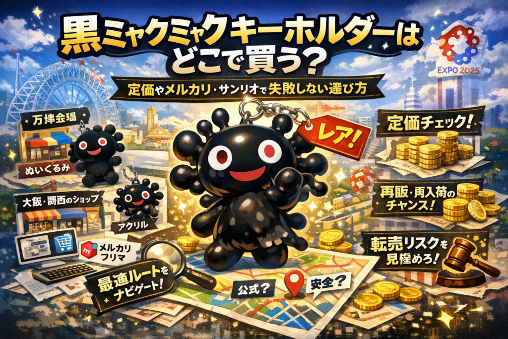 このページでは、黒ミャクミャクの立体PVCキーホルダーやぬいぐるみ、アクリル、365日、アニバーサリーなどの種類を整理したうえで、「どこで売ってるか」「公式かどうか」「定価と値段の妥当ライン」「再販や再入荷の現実」を一本の地図にまとめます。万博会場内外や新大阪などのリアル店舗から、EXPO2025公式ショップ、通販サイト、サンリオ受注、メルカリなどフリマまで、会場に行ける人と行けない人、それぞれが損をしないルートだけを抽出します。