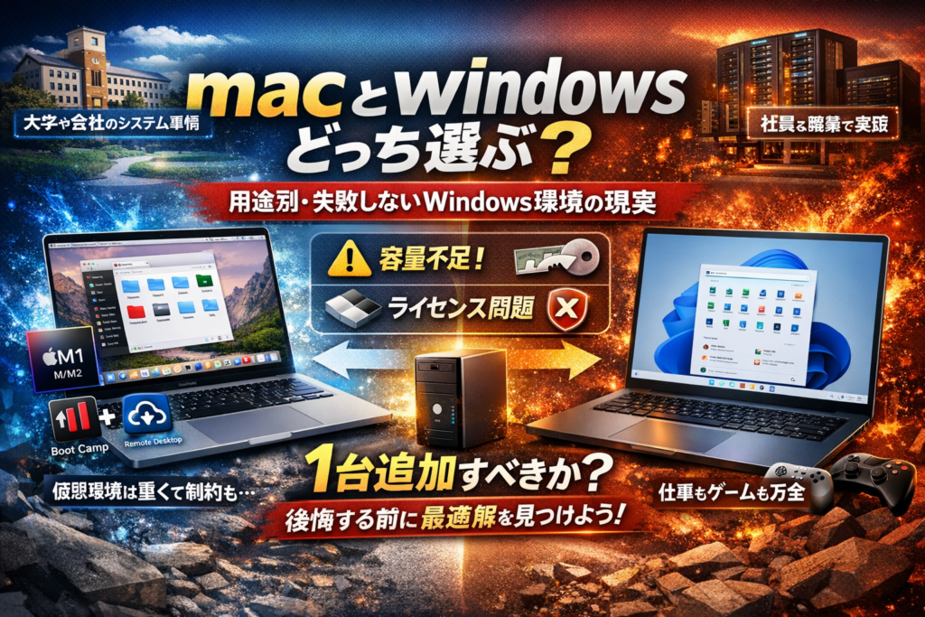 本記事では、用途別に「あなたはmacかwindowsのどちらが正解か」を最初に決め切り、そのうえでmacでwindowsを使う3つのルート(仮想環境・BootCamp・リモートデスクトップ)と、そもそもwindowsパソコンを1台足すべきかまでを実務ベースで比較します。さらに、m1 mac windowsの制約、macとwindowsの操作やキーボード切り替えのギャップ、大学や会社のシステム事情まで含めて、「後から知って後悔するポイント」を先に全部洗い出します。この記事を読み終えるころには、あなたが選ぶべき1台と最適なwindows環境の組み合わせが、迷いなく言語化できているはずです。