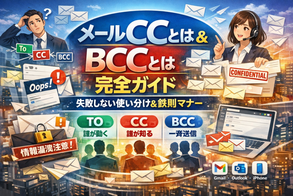 GmailやOutlook、iPhoneメールでのCC・BCCのやり方、BCCメールマナーや返信の扱い、メルマガでBCCを使わない方がいい理由、宛先とCCとBCCを個人技から組織の仕組みに変える方法も一気通貫で扱います。この記事を読み切れば、「メールCCとは」「メールBCCとは」「ToとCCとBCCの違いは」と再検索する必要がなくなり、今日このあと送る1通から、無駄なトラブルと信用低下を確実に避けられます。