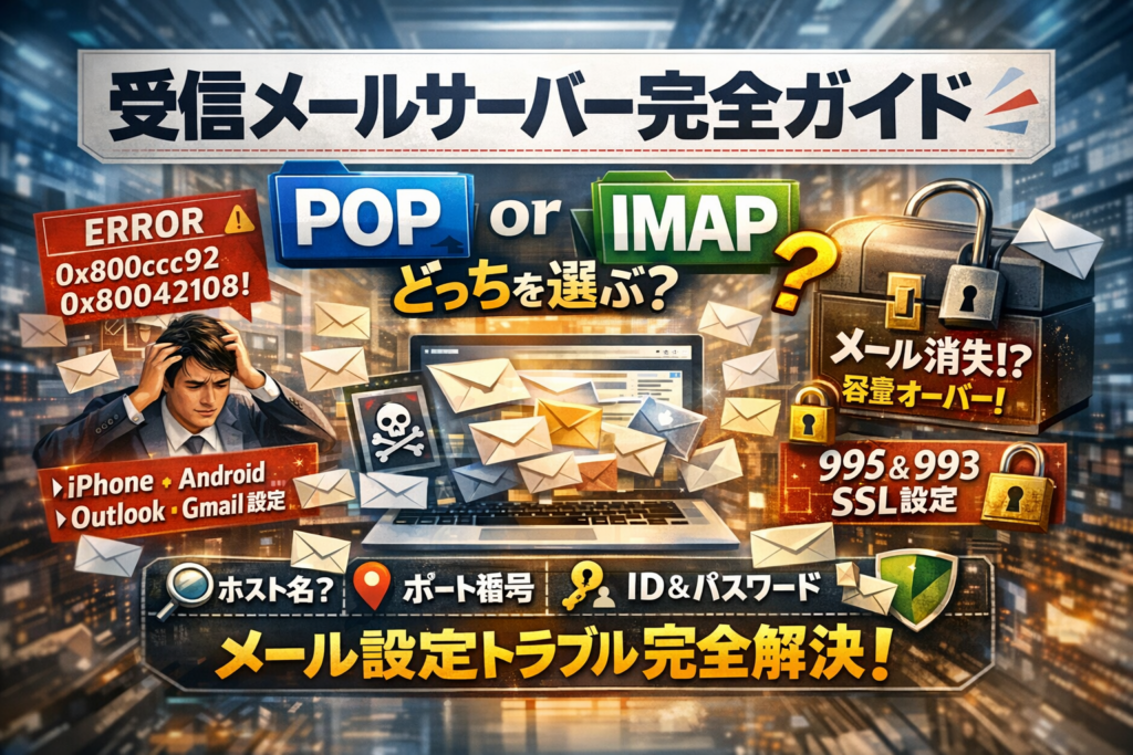 本記事は、受信メールサーバーとは何かという基本から、POPサーバーとIMAPサーバー、SMTPの役割、メール995と993の違い、auやドコモ、Gmail、iCloudごとのホスト名確認方法までを一気通貫で整理します。iPhoneやAndroid、Windowsメール、Outlookでの受信メールサーバー確認方法、エラー0x800ccc0fや0x800ccc92、0x80042108を10分で潰す3点チェックも具体的な手順で示します。