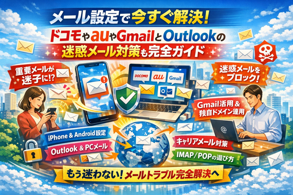 本記事は、単なる「メール設定の仕方」ではなく、今この端末で確実にメール送受信できる状態を作りつつ、今後も迷子にならないメール環境を設計するための実務ガイドです。メール設定画面の出し方から、受信メールサーバーと送信メールサーバー、POPとIMAPの選び方、迷惑メール設定やドメイン指定受信の最適化、iPhoneやAndroid・Windows11・MacでのOutlookやメールアプリの具体的な使い分けまでを、環境別に整理します。