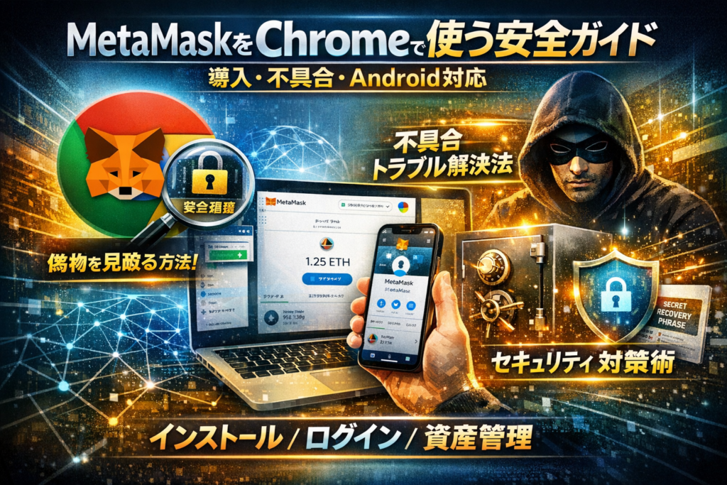 本記事では、MetaMaskをChromeブラウザで安全に使い切るための“正解ルート”だけを絞り込みます。MetaMaskとは何か、なぜChrome拡張で動くのかという前提から、本物のMetaMask 拡張機能を見抜くストアIDの確認、シークレットリカバリーフレーズを守るための運用、メタマスク PC版とスマホアプリの役割分担まで、実務目線で整理します。さらに、Androidのmetamask chrome androidで拡張が入らない理由と公式アプリへの乗り換え方、メタマスク ログイン できないときのチェックポイント、仕事用ウォレットと個人資産をChromeプロフィールで分ける方法まで踏み込みます。この記事を読み終えた時点で、あなたは「どの端末のどのブラウザに、どのMetaMask walletをどう入れるか」を迷わず決められるようになります。