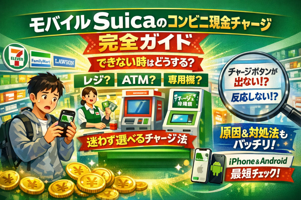 改札まであと数分、残高は数十円。そんなときでも、コンビニを味方にすればモバイルSuicaへ現金チャージは十分間に合います。ポイントは「どこで・どうやって・何がNGか」を一画面で押さえることです。