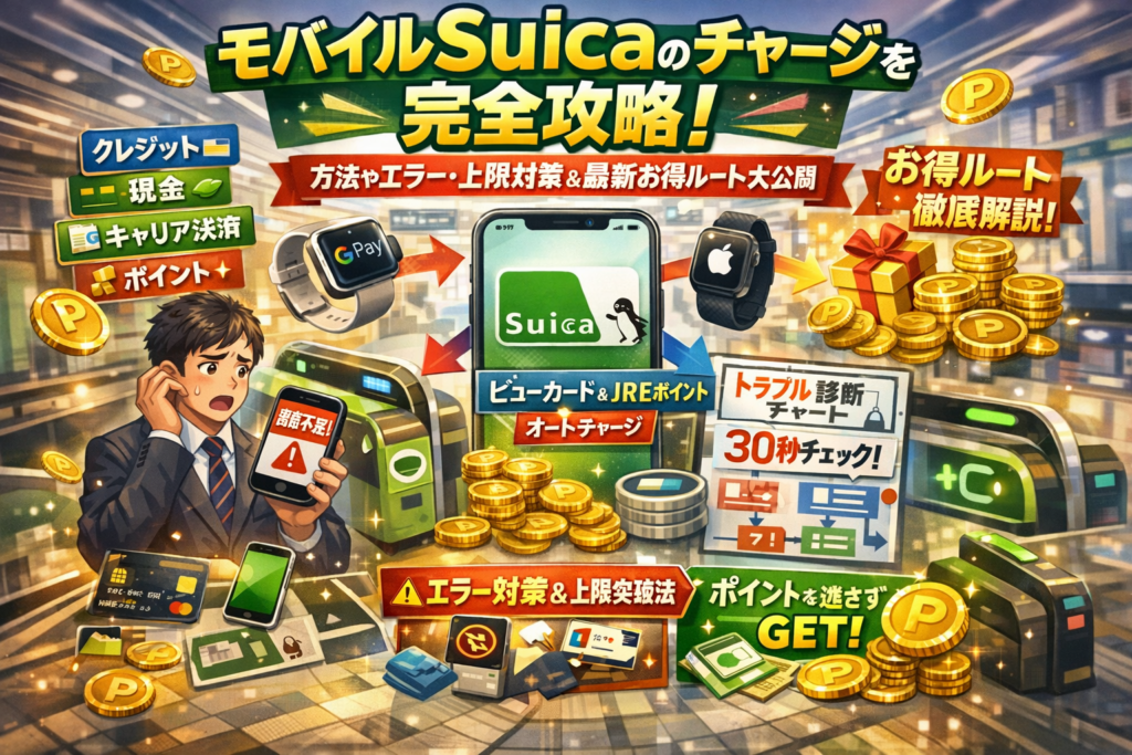 本記事は、モバイルSuicaのチャージ方法を「知る」だけでなく、iPhoneやAndroid、Apple Watch、Google Payといった端末別に、クレジットカード現金キャリア決済コード決済ポイントをどう組み合わせれば、改札で止まらず、かつ無理なくお得を拾えるかまで踏み込みます。