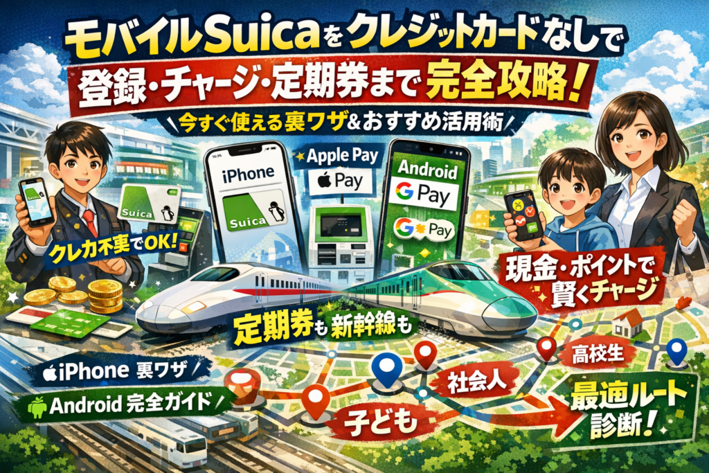 本記事では、クレジットカードなしでも使えるモバイルSuicaとSuicaアプリの「できること/できないこと」を、定期券、新幹線、グリーン券、オートチャージ、チャージ方法まで具体的に線引きします。高校生・大学生、クレカを持たない社会人、子どもや高齢家族に持たせたい人という3タイプごとに、最短ルートと現実的な運用を示します。iPhoneではApple PayのSuicaとSuicaアプリの違い、Androidでは対応端末やNFC、Googleアカウントの落とし穴を押さえ、「登録できない」「チャージできない」を短時間で解消できるようにします。