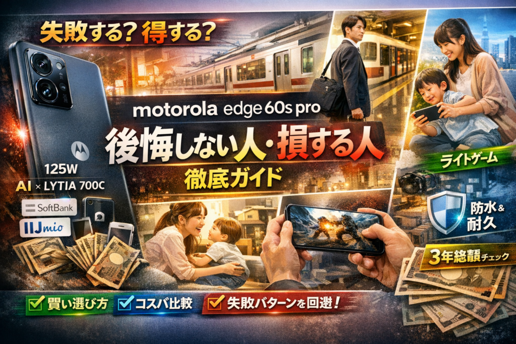 この記事では、motorola edge 60s proを「誰が選ぶと得か/損か」を先に決め、そのうえでAI・カメラ・バッテリー・耐久・SoftBank/IIJmio/中古の4ルートを、業界の現場で使われる基準で分解します。以下のような視点で読むことで、「もう1回も検索し直さずに済む判断軸」が手に入ります。