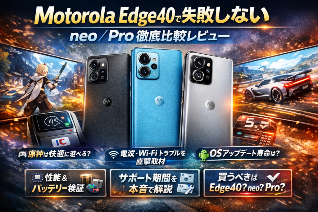 前半(迷いの整理・スペック/体感・1日の使用感・ゲーム性能・不具合) edge 40 / edge 40 neo / edge 40 Pro・他社機との比較軸、原神などゲーム性能の“落とし穴”、電波・Wi‑Fi・FeliCa・充電トラブルの切り分け手順 「どれを選べば後悔しないか分からない」「レビューがバラバラで判断できない」状態から脱し、自分の使い方に合うか即断できない問題