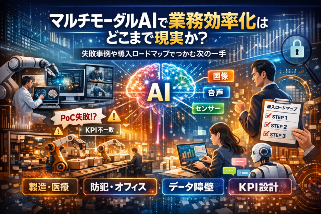 本記事では、マルチモーダルAIとは何かという基礎から、シングルモーダルAIやRPA、生成AI基盤モデル・マルチモーダルLLMとの違いと役割分担を整理し、製造業や医療、防犯、オフィス業務、Webマーケ・CXなどの具体的な活用事例まで一気通貫で解説します。そのうえで、PoCが空振りする典型パターン、非構造データや既存システムの壁、業務側オーナー不在といった現場の課題をどう乗り越えるかを、失敗事例と導入ロードマップとして言語化しました。
