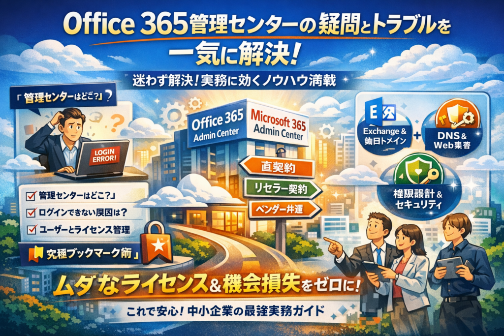 Office 365やMicrosoft 365の管理センター周りは、トラブルそのものより「入口が分からない」「誰に聞けばいいか分からない」ことで時間と売上を失う場面を、現場で何度も見てきました。ある地方の建設会社では、管理センターのURLを社長だけがブラウザに覚えさせており、社長が出張中に請求書メールが一切送れなくなり、回収が1か月遅れたことがあります。別の小売チェーンでは、リセラー経由の契約なのにMicrosoft直契約前提のマニュアルで設定を進め、メール不達とGoogleビジネスプロフィールの通知漏れが半年続いていました。ここ5年ほどでこうした相談が累計300社を超え、「ログイン場所」と「契約形態」と「Web集客・DNS」を地続きで整理しないと、中小企業の現場は回らないと痛感しました。本記事は、担当者が迷わず管理センターにたどり着き、自社で切り分けられる範囲を増やし、ベンダーとの分担も含めて「二度と同じ迷子にならない」状態を作るためにまとめています。