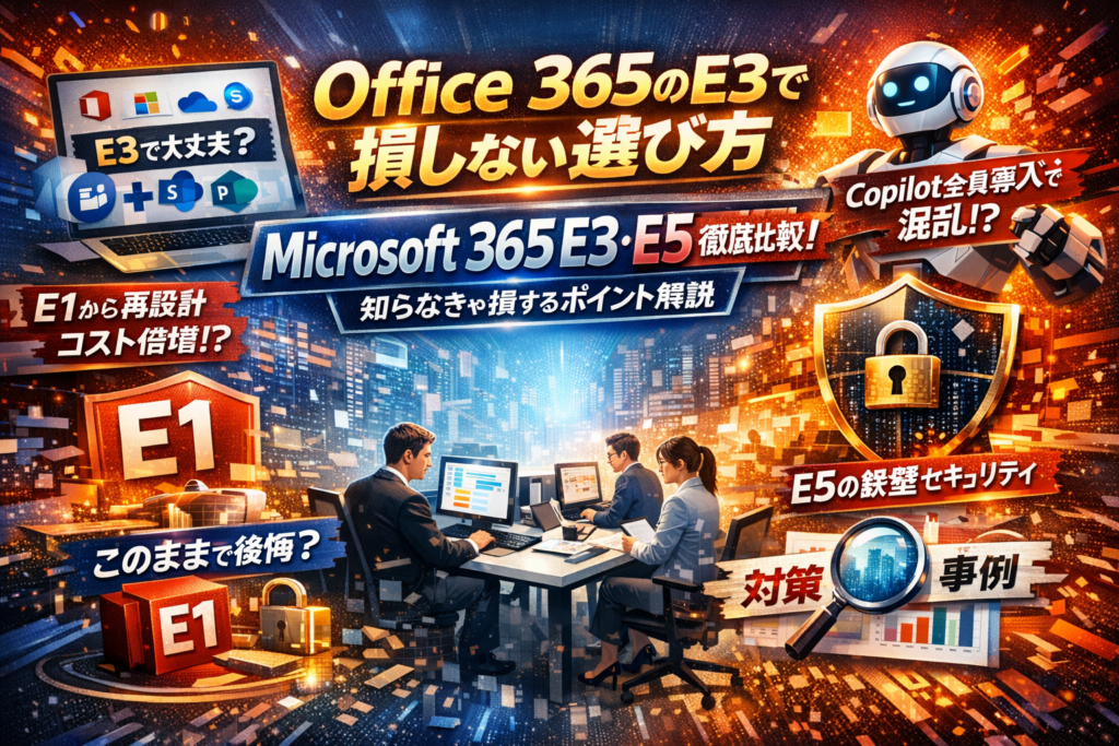 本記事では、Office 365 E3とMicrosoft 365 E3/E5、Business Premiumの違いを情シス目線で整理しつつ、TeamsやOneDrive、SharePoint、Defender、Copilotをどう組み合わせれば「中堅〜中小企業で現実的に回る設計」になるのかを具体的に示します。「うちはOffice 365 E3で十分なのか」「今Microsoft 365 E3へ切り替えるべきか」「E5相当の守りはどこまで必要か」を、失敗事例と判断軸から逆算して絞り込める構成です。