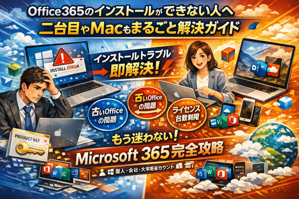 この記事を読み進めれば、「インストール手順」「トラブルシューティング」「ライセンスと二台目のルール」が一つにつながり、もう検索を渡り歩く必要はなくなります。今のトラブルを30分以内に片づけ、その後も迷わないMicrosoft 365運用の土台をここで固めてください。