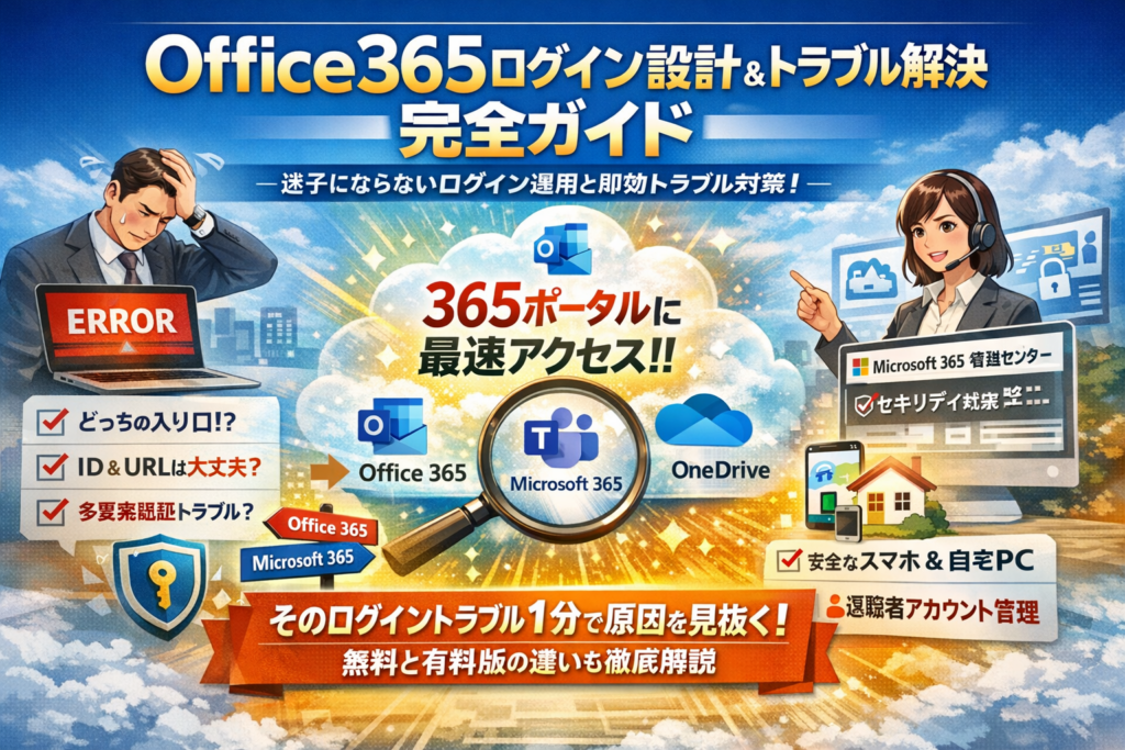 本記事は「すぐに365ポータルへ入りたい人」が最短で正しい入口にたどり着けるようにしつつ、「office 365 ログインできない」「office 365 web版ログインが安定しない」「microsoft 365 管理 センター ログインが分からない」といった現場の悩みを、一分で原因を切り分けるチェックリストと、再発しないログイン運用設計として体系化しました。office 365 ビジネス ログインと個人用microsoft アカウントの違い、スマホや自宅PCからの安全なサインイン、管理者ロールや退職者対応、無料版office on the webとの境界まで、一記事で「迷子にならないログイン設計」と「即効トラブル解決」の両方を手に入れてください。