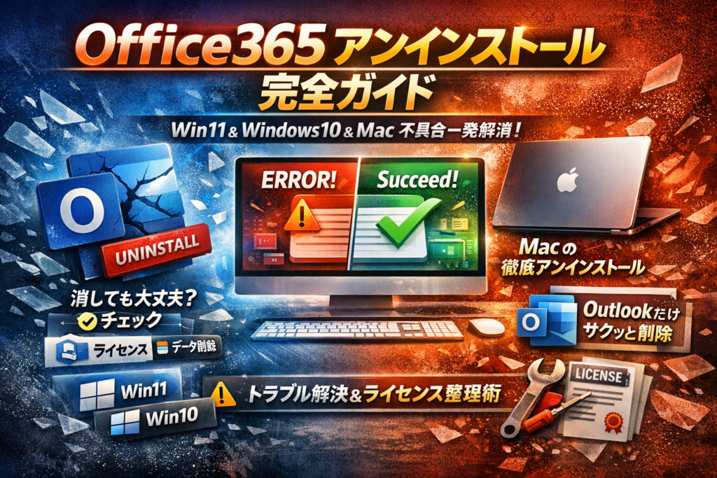 このガイドでは、Windows11とWindows10、MacそれぞれのOffice 365アンインストール方法を整理し、「アンインストールできない」「完全に削除したい」という場面でどこまでツールやレジストリに踏み込むかのラインを明確にします。ショートカットだけ残った状態と本体が残っている状態の見分け方、Microsoft 365をアンインストールしてもライセンス的に大丈夫なケース、Office365とOffice2019の順番ミスをリカバリーする再インストール手順、Outlookだけアンインストールしたいときの現実的な出口まで、一つの記事で網羅します。