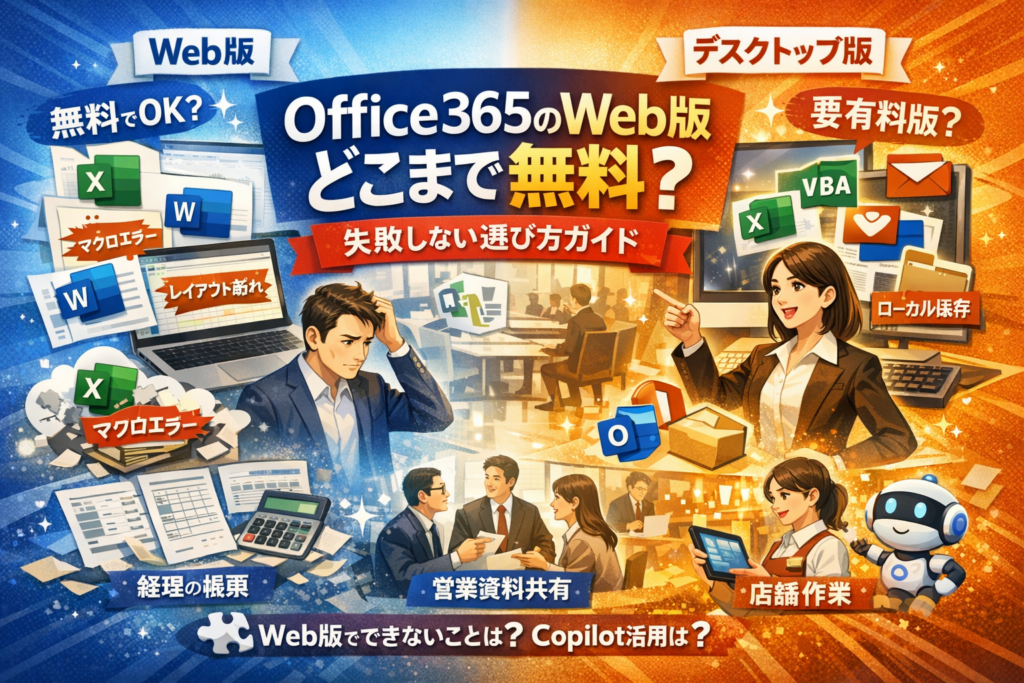 本記事では、Office365 Web版とデスクトップ版の違いを、単なる機能一覧ではなく「経理の帳票作成」「営業資料の共有」「店舗スタッフの入力作業」といった作業シーンで整理します。Excel Web版やOutlook Web版で起きやすい制限、Office OnlineやMicrosoft 365 Web版がどこまで無料で使えてどこから有料が必須になるのか、Web版Officeでできないことと代替策を具体的に線引きします。さらに、OneDrive前提の保存ルール、ローカル保存との付き合い方、アカウント設計、Copilot時代の最適な組み合わせまで、組織としての生産性が落ちない構成だけを抽出しています。