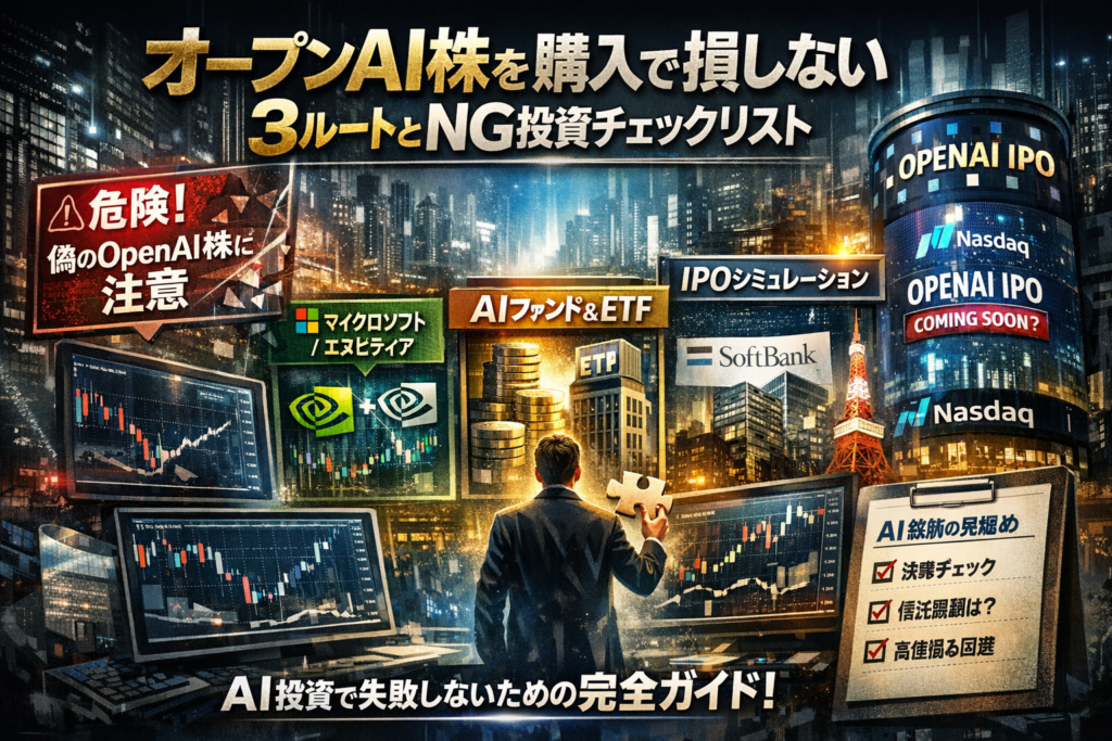 | 前半(OpenAI非上場の現実〜3つの間接投資ルート〜AIファンドの中身と失敗パターン) | OpenAI株を名乗る危険な商品を避けつつ、マイクロソフト・エヌビディア・日本株・楽天のAIファンドなどを使った現実的な銘柄・ファンドの選び方と比率設計 | 「どこでOpenAI株を買えばいいのか分からない」「AIテーマ投資で何を選べばいいか判断できない」という迷い |