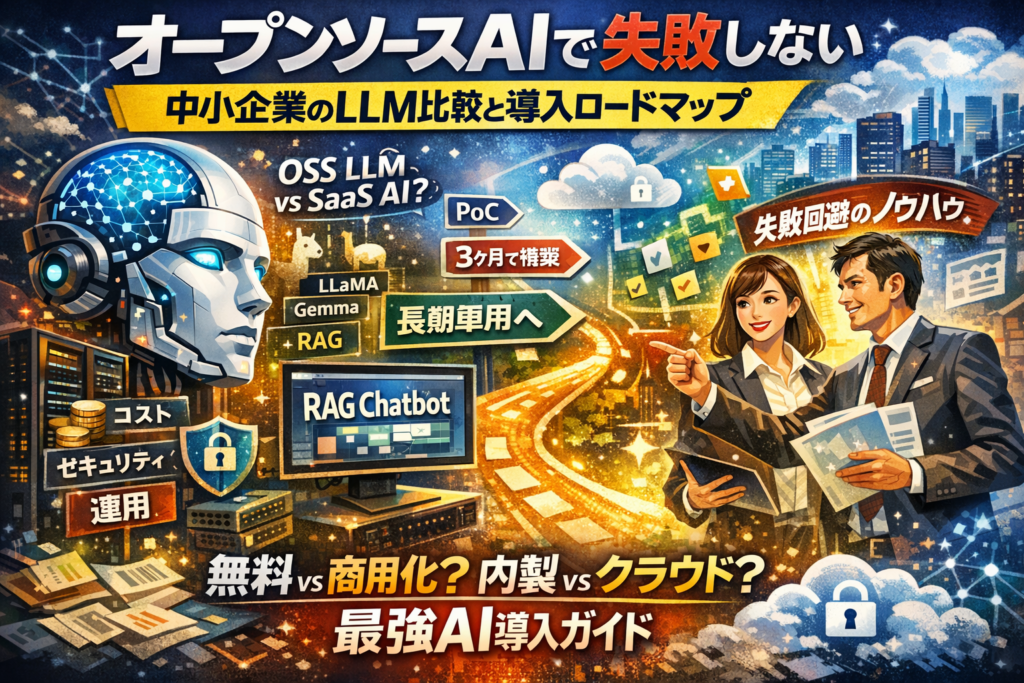 2023年頃から、当社に「オープンソースAIで社内チャットボットを内製したい」という相談が急増しました。実際に支援した中小企業だけでも、ここ2年で約60社がLLaMA系やGemma系モデルを試していますが、そのうち3割はPoCまでは盛り上がるのに、本番直前で止まっています。理由を深掘りすると、GPU費用よりも「要件定義が曖昧なままモデルを選んだ」「PythonとOSSライブラリを扱える担当が退職した」「セキュリティ部門の承認が下りない」といった、人と体制の問題が必ず同時に出ていました。私自身、自社のナレッジ検索用RAGをオンプレ環境で構築した際、VRAM不足で応答遅延が発生し、クラウドとオープンモデルの組み合わせに設計をやり直した経験があります。このとき「無料で制限なし」のはずが、要件整理と検証やり直しに3か月を失ったことが、中小企業に同じ遠回りをさせたくないと思ったきっかけです。本記事では、技術的な比較表だけでなく、私が経営者として見てきた失敗パターンと、3か月でスモールスタートし12か月運用を見据えるための現実的な線引きをまとめました。