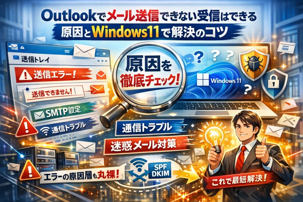 Outlookでメール送信できないのに受信はできる。その瞬間から、見積もりも報告も止まり、仕事全体のスピードが落ちています。多くの解説は「SMTP設定を確認しましょう」で終わりますが、実際の現場では、Windows11や新しいOutlookのUI変更、ウイルス対策ソフト、プロバイダ側のサイレントな仕様変更などが複雑に絡み合い、同じ「送信できない」でも原因の層がまったく違います。