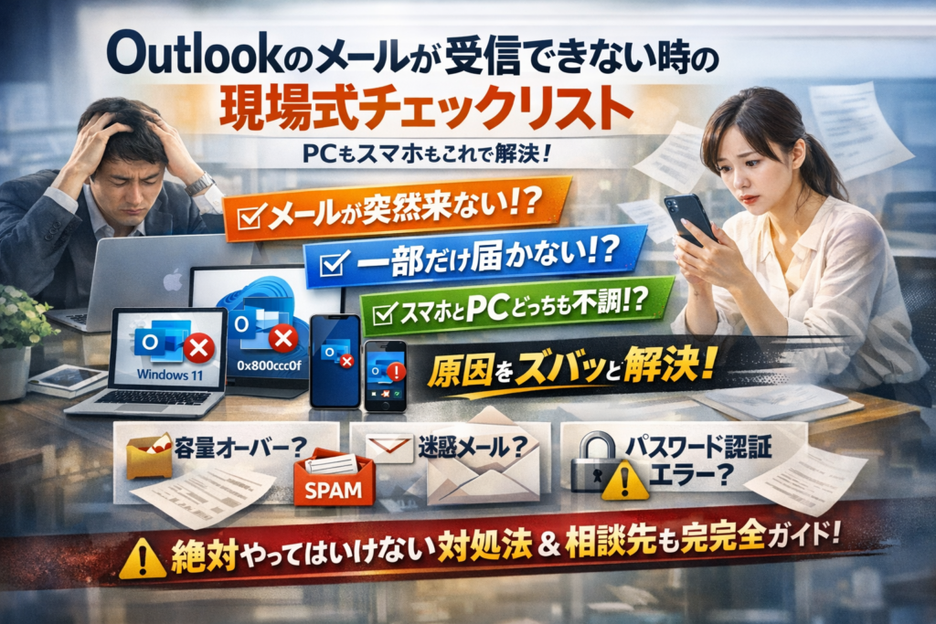 本記事では、「突然すべて受信できない」「送信はできるが受信だけできない」「一部のメールだけ届かない」といった実際の症状からスタートし、PCとスマホ、windows10とwindows11、新しいOutlookとOutlookclassicを一気に切り分けます。そのうえで、インターネットはできるのにOutlookだけ受信できないケース、容量オーバーや迷惑メール、0x800ccc0e/0x800ccc0fなどのエラーコード、iPhoneやスマホアプリだけ同期されない問題まで、現場で使われている順番で確認していきます。