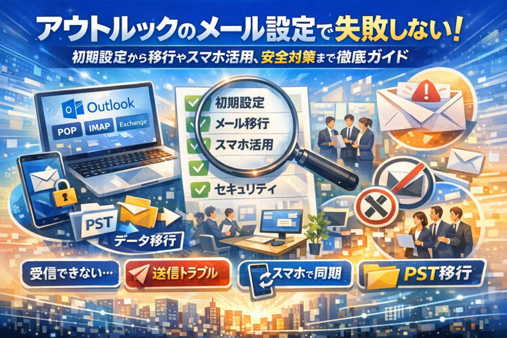 本記事は、Windows11やWindows10のOutlook初期設定やアカウント追加の手順にとどまらず、「会社メールをスマホのOutlookアプリで安全に見る構成」「パソコン買い替え時のPSTエクスポートによるメール移行」「パスワードは合っているのにサーバーに接続できない時の切り分け」「誤送信防止ポップアップや送信遅延、署名テンプレの設定」まで、業務で必要なアウトルックメール設定を一気通貫で整理します。
