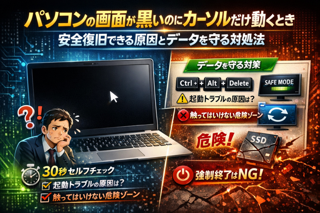 画面が真っ黒でカーソルだけ動く瞬間、多くの人が心配するのは「直るかどうか」ですが、本当に怖いのは仕事や生活の止まり方です。