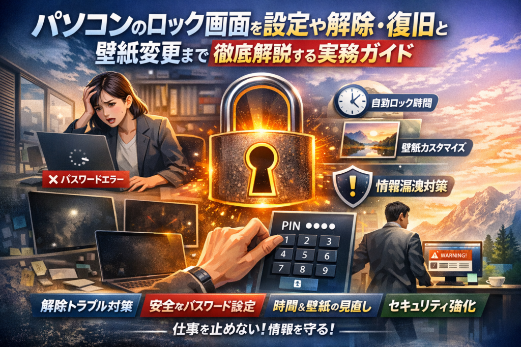 この記事では、Windows10/Windows11のパソコン ロック画面について、設定や解除、時間設定、壁紙変更から、「ロック画面から動かない」「ぐるぐるして進まない」「マウスは動くがキーボードが反応しない」といった緊急トラブルまで、実務で必要なポイントだけを体系的に整理します。ロック画面とスリープやスクリーンセーバーの違い、ショートカットで一瞬ロックする方法、パスワードやPIN、顔認証の安全な組み合わせ方、「パスワードなし」「画面ロックさせない」をどこまで許容してよいかのラインも明確にします。