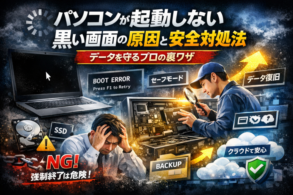 パソコンが起動しないで黒い画面のまま止まり、「画面真っ暗 電源ついてる」「カーソルだけ」「ぐるぐるが続く」「白い英語の文字やF1 F2」といった症状に直面した瞬間、多くの人がまずやるのが電源ボタン長押しと再起動の連打です。ところが、この「なんとなくの対処」がシステム破損やHDD/SSDの障害を呼び込み、データ復旧費用と業務停止時間を一気に膨らませます。この記事は、富士通やDell、Lenovo、ThinkPadなどノートパソコンを含むあらゆるPCで、黒い画面から安全に切り抜けるための最短手順と、やってはいけないNG行動を具体的に整理しています。症状別に原因を切り分け、セーフモードやスタートアップ修復での脱出ルートを示しつつ、「ここから先は業者レベル」という境界もはっきりさせます。さらに、今回のトラブルをきっかけに、メールや顧客データをクラウドに移し、次にパソコンが黒い画面のまま起動しない事態になっても仕事や家庭のデータを止めない仕組みまで設計します。今、目の前の一台だけをどうにかする記事ではなく、「二度と同じ冷や汗をかかない」ための実務的な答えをまとめています。