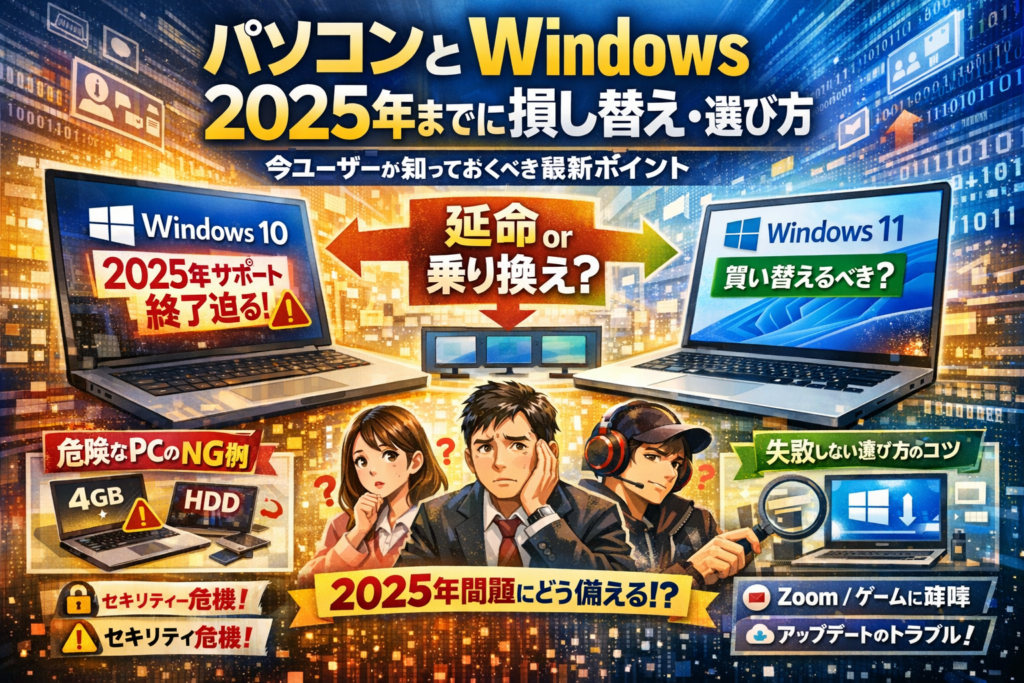 ここ数年、大学の情報システム担当者や中小企業の経営者から「Windows10のままでいいのか」「どのタイミングで買い替えるべきか」という相談が、年間で二百件近く続いています。実際に支援先の企業で、営業全員のパソコンが古いHDD搭載機のままTeams会議にフリーズが連発し、商談の成約率が落ちたケースもありました。逆に、家電量販店のポップだけを頼りに高価なゲーミングノートを導入し、実務では性能を持て余して経費だけが増えた会社もあります。学生に目を向けると、文系の新入生が五万円台のノートを選び、オンライン授業の途中で固まってレポート提出が遅れたという相談を、2020年以降毎年受けてきました。共通するのは「自分の用途とWindowsの状況を言葉で整理できていない」ことです。この記事では、売り場の都合ではなく、現場で起きた失敗と成功の分かれ目を基準に、2025年以降も損をしないパソコンの選び方を具体的に示したいと考えています。
