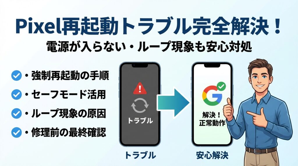 本記事は、Pixel 5aからPixel 9a、7 Proや8 Proまでのシリーズを対象に、通常の再起動と強制再起動の方法、長押し時間の目安、セーフモードやRecovery Modeの使い方を症状別×機種別で整理します。電源が入らない、再起動を繰り返す、夜中に勝手に再起動する、といったGoogle Pixel特有のトラブルを、アプリ・OS・ストレージ・ハードのどこに問題があるか段階的に確認できるように設計しています。
