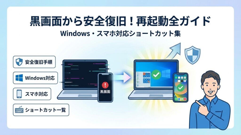 本記事は、「再起動 ショートカット」だけでなく、黒画面から安全に復旧し、同じトラブルを繰り返さないための実務ガイドです。Windows10とWindows11でのAlt+F4やWin+X、Ctrl+Alt+Delを使った再起動のショートカットキー、再起動ショートカットアイコンの作成手順、リモートデスクトップ越しのshutdownコマンドの活用まで具体的に解説します。さらに、画面真っ暗で矢印だけ表示されるケースや、更新プログラム中に再起動が終わらない場面での優先順位付き対処法、MacやiPhone、Androidスマホの強制再起動との違いも整理します。