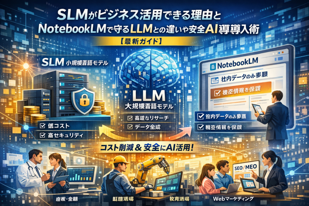 社内で生成AIを試してみたものの、コストが読めず、情報漏洩も怖くて踏み込めないまま時間だけが過ぎていないでしょうか。実は今、LLMで高度なリサーチやデータ合成を行い、日常業務や特定タスクはSLM(小規模言語モデル)で回すという役割分担が進みつつあり、これが中小企業の「ムダなAI投資」をゼロにする鍵になっています。大きなモデルほど優れているという前提はすでに崩れ、軽量で特化したSLMを自社データに合わせて活用することが、コストとセキュリティという二大課題の最も現実的な解決策になりつつあります。さらに、自社資料だけを参照するNotebookLMのようなソース限定型AIを使えば、「学習されない」「参照元が明示される」という特性を活かしながら、機密情報を守ったままナレッジ検索や社内FAQ自動化を実現できます。この記事では、SLMとLLMの本質的な違いから、医療や金融、製造業、教育、Webマーケ現場での具体的なビジネス活用シナリオ、NotebookLMの料金や情報漏洩リスクへの実務対応、さらに導入ステップと失敗パターンまでを一気通貫で整理します。モデル選定より「どの業務を、どの順番で自動化するか」にピントを合わせ、自社にとっての最適なAI活用ロードマップを描ける内容になっています。