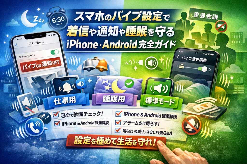 「マナーモードにしたのに鳴る」「Androidのバイブ強さが変更できない」「iPhoneの通知をバイブのみにしたい」といった再検索ワードも、トラブルシュートQ&Aで一気に解消します。単なる操作説明ではなく、あなたの生活と仕事を守る通知とバイブの設計図として活用してください。
