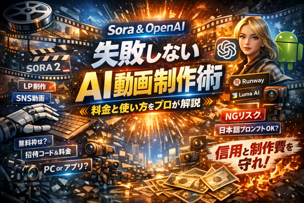 | 前半(Soraの正体・料金・使い方・得意不得意・トラブル回避) | Sora OpenAIの料金と無料枠を日本円で判断する軸、PC版とSora AIアプリ(Android含む)の正しい使い分け、Sora 画像から動画の活かしどころ、ポリシー落ちやエラーを事前に潰すチェックリスト | 「Soraとは何か」「いつから・いくらで・どう使うか」が曖昧なまま検証を始めて、工数と公開スケジュールを崩す問題 |