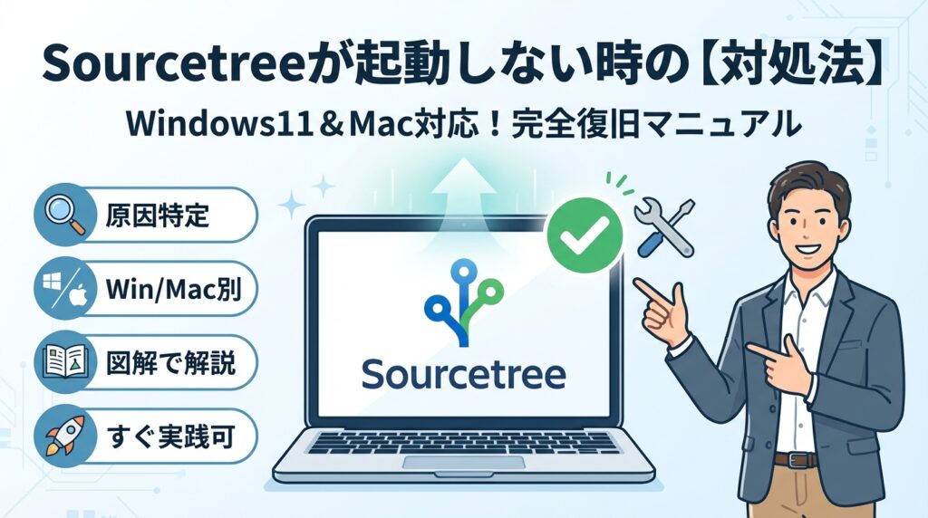 本記事は、「sourcetree 起動しない windows11」「Mac sourcetree 起動しない」「Windowsupdate後だけ落ちる」「SourceTree ロード中から進まない」「WinMergeや外部diffやターミナルやsshエージェントだけ起動しない」といったバラバラの症状を最短で切り分ける診断フローと、Windows11/Windows10とMacそれぞれで安全に消してよいフォルダと絶対触ってはいけない場所の境界線を具体的なパス付きで示します。さらに、イベントビューアーやコンソールログで原因をあぶり出す手順、クリーン再インストールの正しいやり方、Git作業を止めない応急代替案、そしてチームで再発させないための運用ルールまで一気に整理しました。