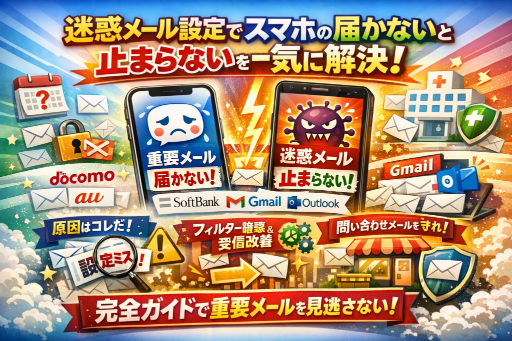 本記事では、「迷惑メールをブロックしたい」「迷惑メール設定解除をしたい」「メールが届かないのに迷惑メールにもない理由を知りたい」といった悩みを、症状別に分解します。そのうえで、iPhone/Androidの迷惑メール設定、各キャリアのメールフィルター、GmailやOutlookの迷惑メールフォルダ確認と復活手順までを、一気通貫で整理します。