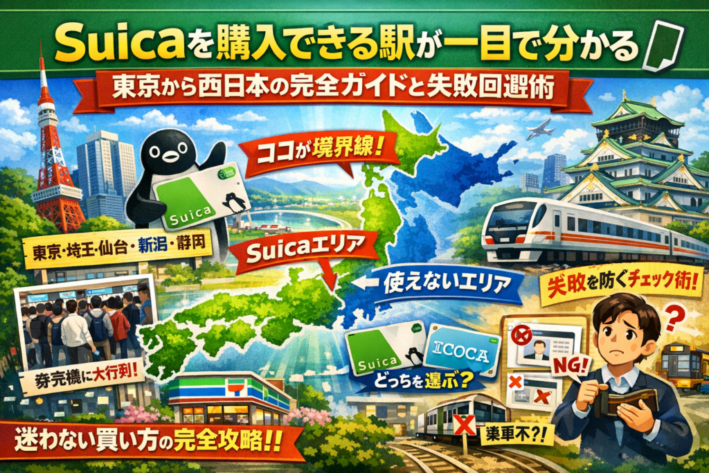 本記事では、Suicaを購入できる駅を東京周辺から仙台・新潟・静岡・長野・群馬・北海道・茨城まで一気に整理し、西日本でSuicaを購入できる駅とSuicaが使えない路線の線引き、SuicaとICOCAどっちがいいかという再検索ワードまで一続きで解消します。さらに、コンビニでのSuica購入可否やネット・モバイルSuicaとの違い、子ども用Suicaの書類忘れ、券売機大行列など、現場で起きている失敗例と回避策も具体的に示します。この記事を読めば、「どの駅でSuicaを買うか」で迷う時間とリスクを、今日からまとめて削ることができます。