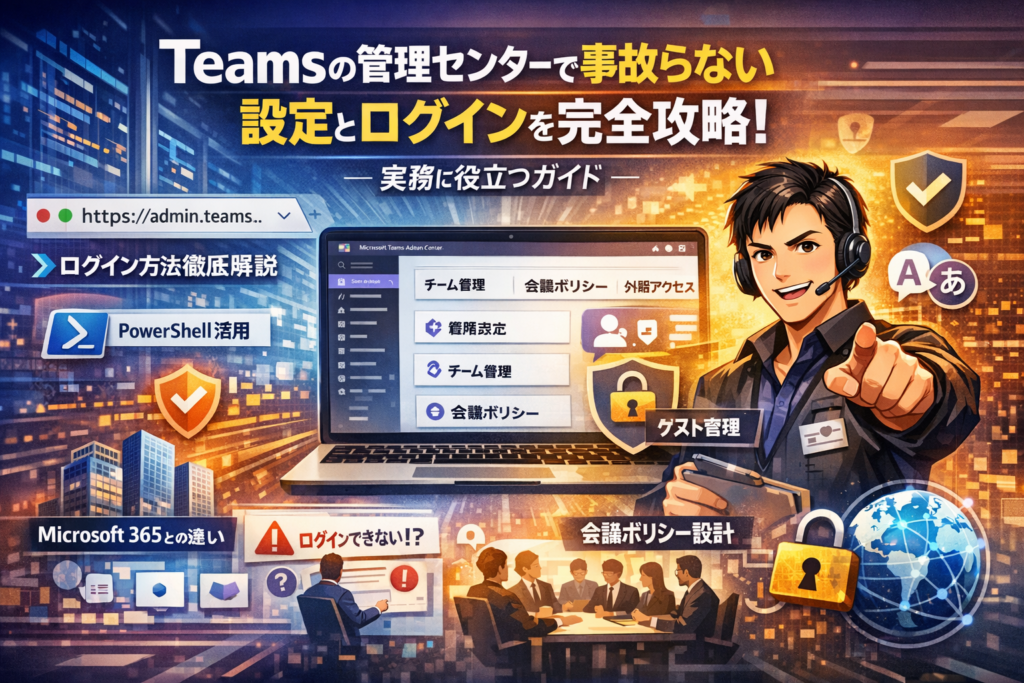 このガイドでは、Teams管理センターとは何かをMicrosoft 365管理センターとの違いから整理し、「Teams 管理センター どこ」「ログイン 方法」「日本語化」「外部アクセス」「会議ポリシー」「権限」「PowerShell」といった再検索の悩みをひとまとめに解体します。URLからの正しい入り方、管理者ロールと権限、表示されない原因の切り分け、日本語表示の限界と割り切り方、外部アクセスとゲストアクセスの設計、会議ポリシーの分割、文字起こしや録画が使えないときの確認ポイントまで、事故を起こさないために最低限押さえるべき設定だけに絞って解説します。読み終える頃には、「Teamsの管理センターで何をどこまでやれば安全か」が自分の言葉で説明できる状態になっているはずです。