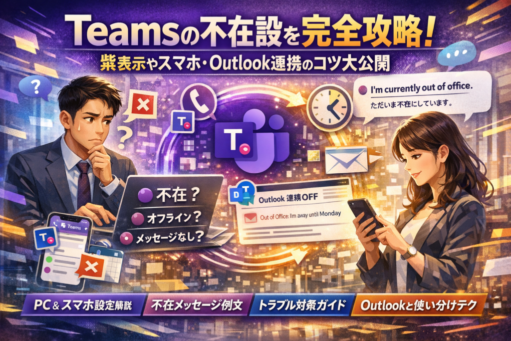 本記事では、PCとスマホアプリのTeams 不在設定を最短ステップで押さえつつ、Outlook連携をあえて切る運用、Presence仕様を前提にした現実的なルール作り、すぐコピペできる日本語・英語の不在メッセージ例文、設定がうまく動かないときの切り分け方までを一気通貫で整理します。読み終えるころには、「Teams 不在設定 紫」「不在で応答しない場合があります」「Outlook連携させない」といった個別の疑問がすべて一本の線でつながり、チームとして迷わない運用に切り替えられるはずです。