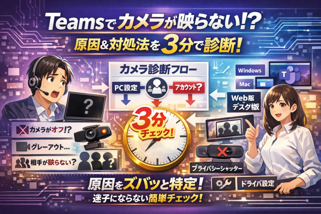 本記事は、会議前に1分で試す超速チェックから、「プレビューも映らない」「プレビューは映るのに会議で映らない」「相手や複数人だけ映らない」といった症状別診断、Windows11やMacのカメラ許可設定、Teams Web版とデスクトップ版を使ったプロ流の切り分けまでを実務の手順どおりに整理しています。闇雲に再インストールする前に、この診断フローに沿えば、原因が設定なのかアカウントなのかPCなのかを3分で特定し、再発もしにくくなります。「Teams カメラが映らない 設定どこ?」と検索し続ける時間そのものを削るためのロードマップとして使ってください。