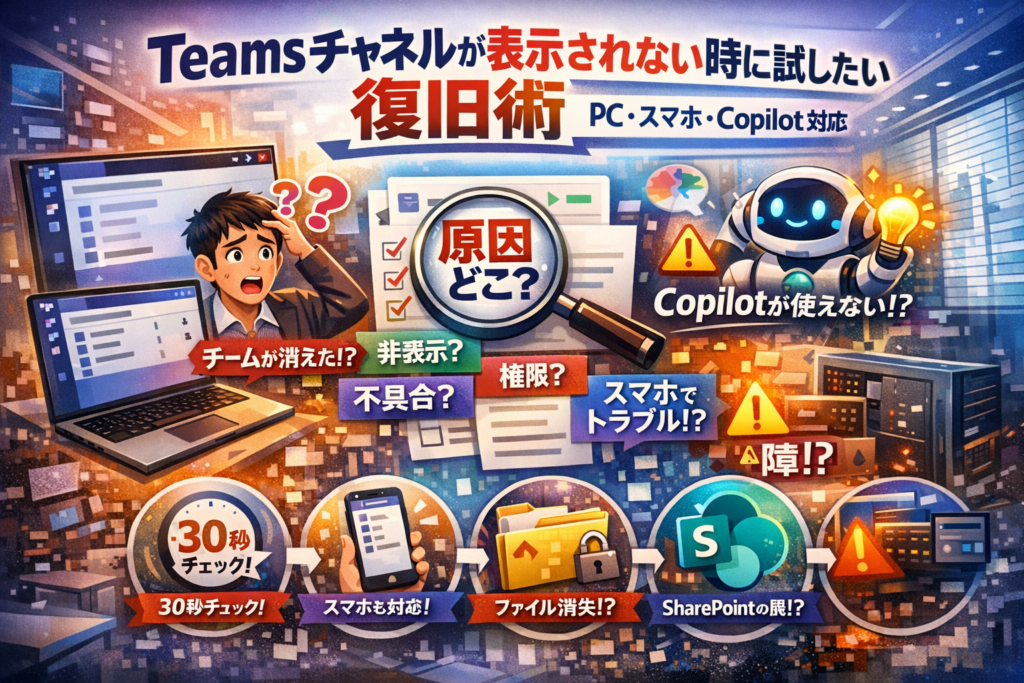 本記事では、左側の「チーム」アイコンが消えた場合、特定チャネルだけ表示されない場合、スマホ・iPhoneのTeamsアプリだけチャネルが見えない場合、チャネル内のファイルやフォルダが表示されない場合を、30秒で判定できるよう構造化しています。PC版・Web版・スマホ版を使った切り分け、非表示やフィルターの解除、表示モードの見直し、サインアウトやキャッシュ削除といった基本から、SharePoint権限の罠、combined viewの既知トラブル、Copilotを使いたいのにチャネルや会議が表示されないケースまで、実務で多発するパターンを網羅しています。