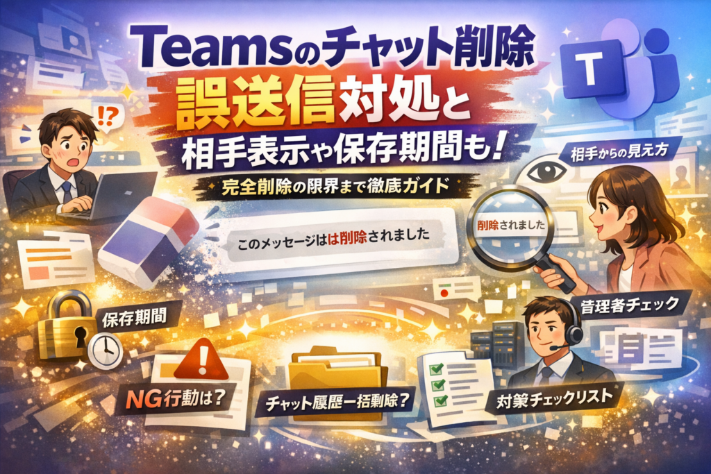 本記事では、誤送信直後に取るべき1行のフォローから、削除と非表示とミュートの違い、1対1チャットとグループチャットと会議チャットの挙動、削除ボタンがない時の原因切り分け、Teamsチャット履歴の一括削除や復元の現実、保存期間とガバナンスを踏まえた運用ルール設計までを、利用者と管理者の両方の目線で解説します。「自分の画面から消えること」と「組織から本当に消えること」の差が分かると、誤った安心や不要な不安がなくなります。誤送信対応で迷う時間と、後からトラブルになるリスクをここでまとめて削ってください。