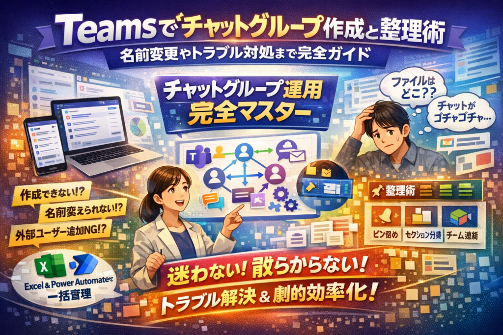 このガイドでは、Teams チャットグループの作成方法をPCとスマホで比較しながら、「作成できない」「名前変更できない」「外部ユーザーを追加できない」原因の切り分けまで一気に整理します。さらに、グループチャットとチーム(チャネル)・会議チャットの違い、ファイルの保存先の実務的なリスク、セクションとピン留めを使ったチャット整理術、ExcelやPower Automateを使ったメンバー一括追加の入り口まで、現場で本当に効く運用パターンだけを厳選しています。