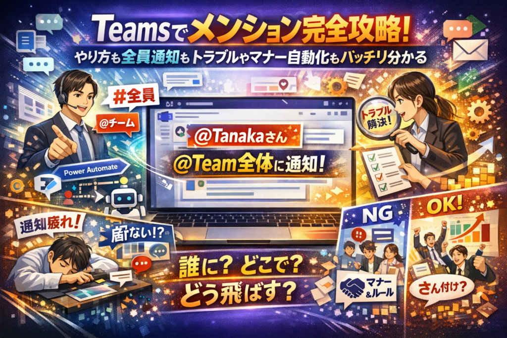 本記事では、Teamsメンションの基本の仕方から、チーム全員やチャネル全体への通知の正しい考え方、「出てこない・できない・赤字にならない」の実務的なチェックリスト、さん付け・皆様問題を含むマナーと社内ルールの作り方、さらにPower Automateやwebhookを使った自動投稿の設計までを一気通貫で整理します。