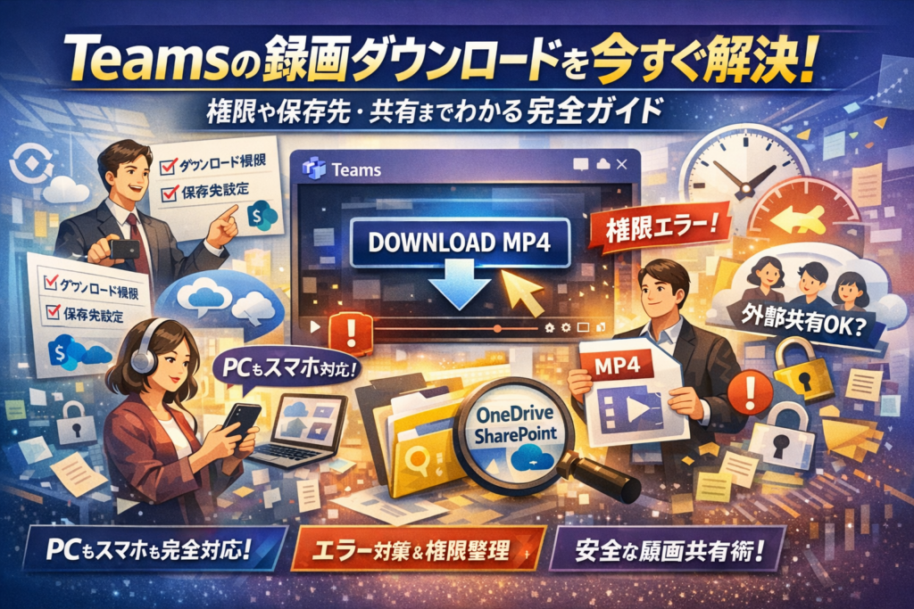 Teamsの録画があるのにダウンロードできず、会議の振り返りや研修資料の共有が止まっているなら、このまま放置するほど損失が膨らみます。録画の保存先がOneDriveかSharePointか、会議が標準会議かチャンネル会議か、主催者か共同開催者か一般参加者か──この組み合わせで「ダウンロードできるかどうか」「共有できるかどうか」が決まり、単純な手順解説だけでは解決しません。多くの解説は「Teams会議録画ダウンロード方法」や「Teams録画保存先」を説明するだけで、主催者以外で扱いたい時の権限付与、期限切れや自動削除、組織外共有ポリシーの変更といった現場のトラブルまでは踏み込んでいません。この記事では、PCとスマホでの具体的な録画ダウンロード手順から、「Teams録画ダウンロードできない」時の原因の切り分け、「主催者以外でも録画ダウンロードしたい」場面の現実的な対処、さらに保存期間や運用ルールの設計までを一気通貫で整理します。読み終えるころには、目の前の録画を安全にMP4として入手し、今後同じ混乱を繰り返さないための社内標準まで描ける状態になっているはずです。