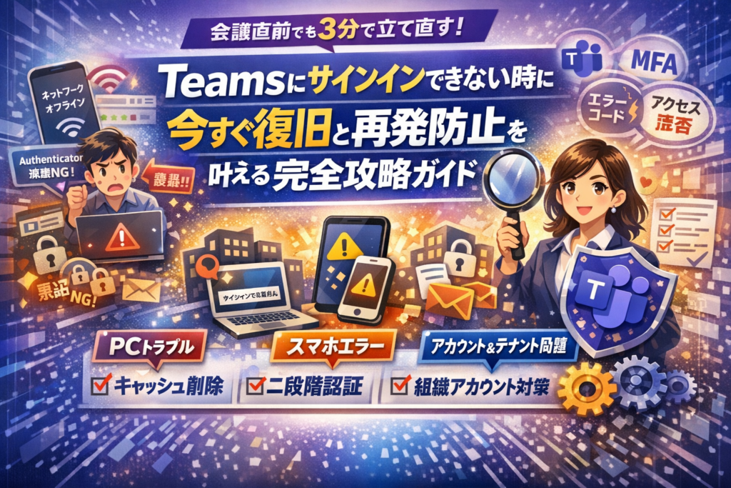 本ガイドは「Teams サインインできない」「ログインできない ループ」「スマホだけネットワークオフライン」「職場または学校アカウントや学校アカウントだけ弾かれる」「Authenticatorの承認で止まる」といった典型パターンを、PCとスマホ、個人と職場・学校、ゲストと組織切り替えまで一気に整理します。冒頭では会議直前でも3分で試せる応急処置だけを抽出し、「問題が発生しました」「お客様をサインインできませんでした」と出た直後にやるべき3手と、やってはいけない対処を明確に区別します。続く章で、デスクトップ版とブラウザ版のループを断ち切る具体手順、iPhoneやAndroid特有のサインインエラー、エラーコードや「このTeams組織」「アクセス許可が必要です」が示すテナント側の事情、Microsoft AuthenticatorとMFAの安全なやり直し方まで、再発防止も含めて実務レベルで分解します。この記事を読まずに手探りを続けること自体が、会議の機会損失と余計なトラブルの温床になっています。