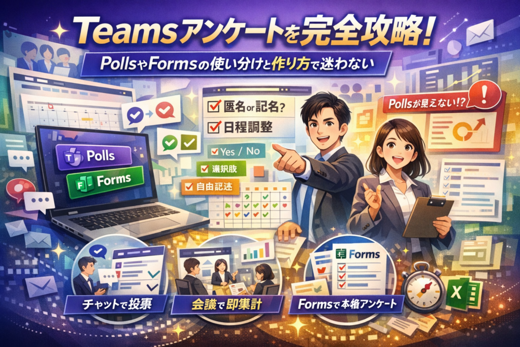 Teamsでアンケートを取るたびに、「どこから作ればいいか」「PollsとFormsのどちらを使うべきか」「出欠や日程調整をどう設計するか」で毎回立ち止まっていないでしょうか。多くの解説は、Teamsアンケート機能やFormsアンケートの作り方だけをなぞり、匿名/記名の誤解や、複数質問・自由記述を盛り込みすぎて誰も回答してくれないといった実務の失敗までは踏み込んでいません。その結果、チャットでの簡易アンケートから会議中のリアルタイム投票、ウェビナー後アンケート、出欠確認や日程調整まで、本来はTeamsだけで完結できる場面でも、メールや外部ツールとの二重運用が続き、集計や回答者確認に余計な時間を奪われています。この記事では、Teamsアンケートの全体像を3分で把握しつつ、PollsとMicrosoft Forms、Pollyなど外部ツールのリアルな使い分けを示し、チャット・チーム・会議ごとの具体的な作り方から、日程調整テンプレ、集計とExcelエクスポート、そして「Formsが追加できない」「Polls結果が見えない」時の即応チェックまで一気通貫で整理します。読み終える頃には、自分のシーンでどの手段をどう設定すればよいかが即断でき、Teamsアンケートを「一発モノ」ではなく社内標準の仕組みに変える道筋がはっきり見えるはずです。